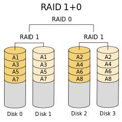 RAID 1+0是先镜射再分割资料。是将所有硬盘分为两组,视为是RAID 0的最低组合,然后将这两组各自视为RAID 1运作。RAID 1+0有着不错的读取速度,而且拥有比RAID 0更高的资料保护性。