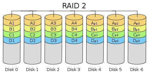 RAID 2(位级专用海明码校验的数据分割),所有的磁盘主轴旋转是同步的,数据是分割的,每个顺序位在不同的驱动器上。海明码校验跨越相应位计算,至少有一个奇偶校验驱动器上存储。