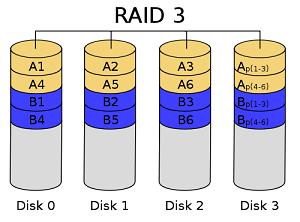 RAID 3(字节级专用奇偶校验的数据分割),所有的磁盘主轴旋转是同步的,每个连续的字节在不同的驱动器上。跨越相应的字节和奇偶校验计算,存储专用奇偶校验驱动器上。