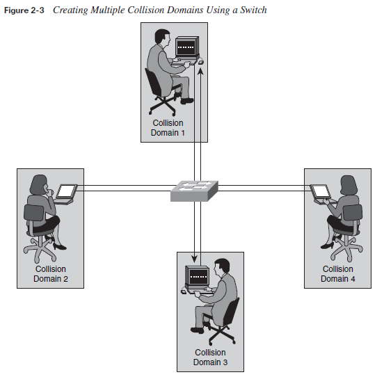 然而,也可以用工作在OSI模型的第2层或以上层的其他网络设备,将网络划分成段,减少竞争带宽的设备数。每一个新的段会产生一个新的冲突域。一个段中设备可以使用更多的带宽,一个冲突中的冲突也不会另一个段中的操作。下图显示了用交换机将用户和设备隔离到他们自己的冲突域中。