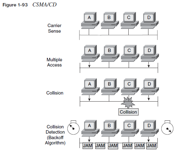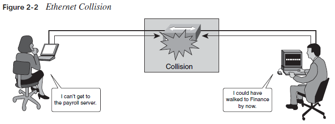 由于在第1层以太网段上的所有设备共享带宽,一次只有一台设备可以发数据。又由于没有控制机制来声明一台设备何时可以发数据,冲突就会产生。如下图: