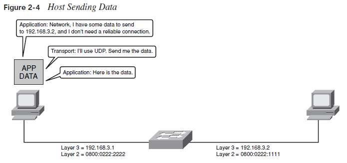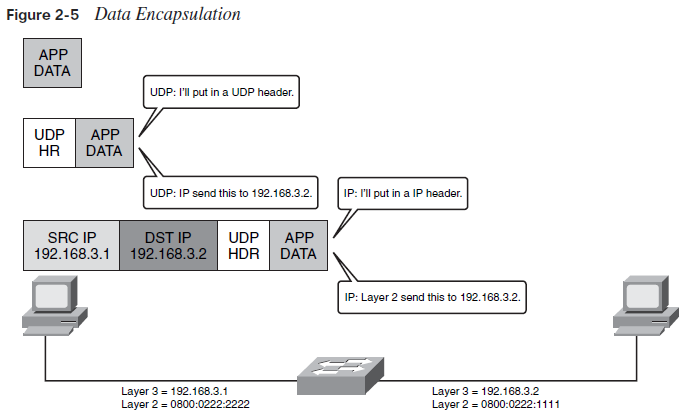 由于不需要用UDP建立第4层的会话,基于UDP的应用程序可以开始传数据了。数据封装过程如下图。