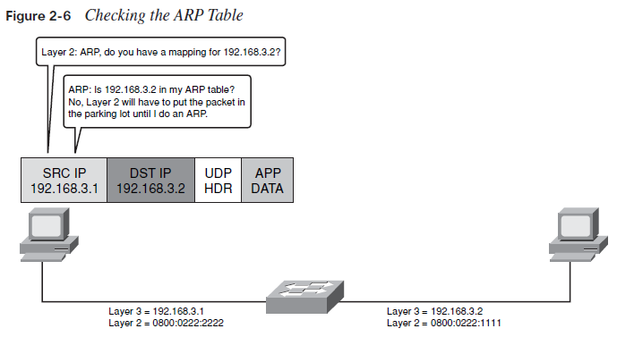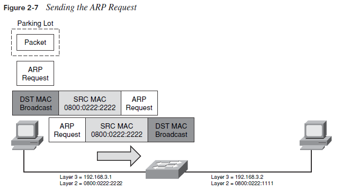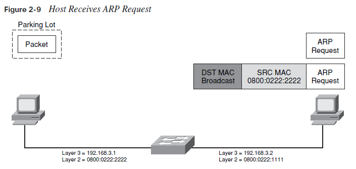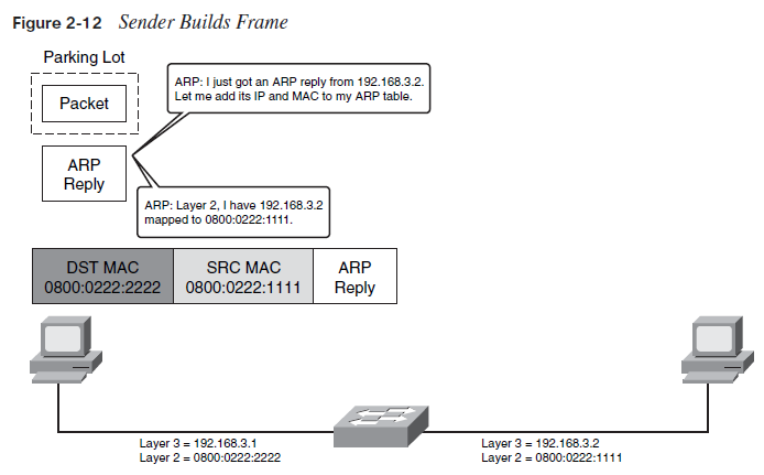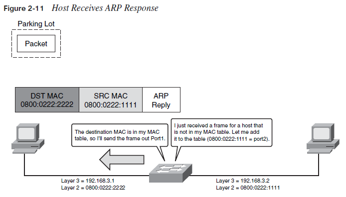 主机192.168.3.1使用IP地址192.168.3.2发ARP请求来学习对端设备的MAC地址。但这个例子里,ARP广播帧在到达远程主机前是由交换机接收的。如下图: