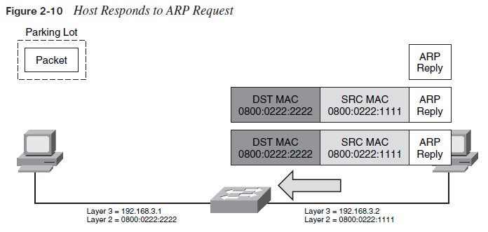 目的主机(除源主机外的所有主机)通过ARP广播收到了ARP请求。IP地址为192.168.3.2的主机应答ARP请求,方法是直接应答特定的MAC地址。目的主机同时读取原始ARP广播帧中的源MAC地址,就像交换机一样,完成MAC的学习。如下两图所示。