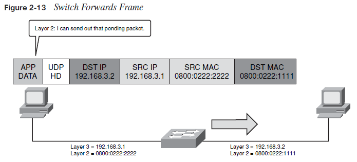 发端主机收到ARP应答后,填写自己的ARP缓存,将数据包从临时停放处移出来,加入合适的第2层目的MAC地址进行传送。如图2-12所示。数据发到交换机时,交换机查找MAC地址表,将数据帧从合适的端口转发出去给收端主机。如图2-13所示。