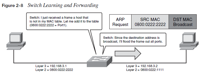 交换机收到帧后,需要将帧转发给合适的端口出去。这个例子中,交换机的MAC地址表中既没有源MAC地址也没有目的MAC地址。交换机可以学习MAC地址。交换机读取帧中的源MAC地址,将该地址和学习端口加到MAC地址表。现在,交换机知道源MAC地址并且知道要去这个MAC地址需要用哪个端口。