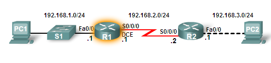 PC 通常配置单一的主机 IP 地址,因为它只有一个网络接口(一般是以太网网卡)。路由器则有多个接口,每个接口必须是不同网络的一员。在右图中,R1 属于两个不同的网络:192.168.1.0/24 和 192.168.2.0/24。路由器 R2 也属于两个不同网络:192.168.2.0/24 和 192.168.3.0/24。