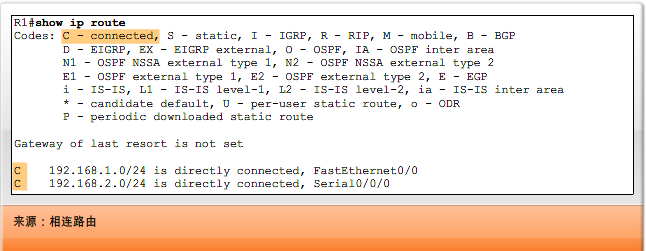 如下图所示,使用 show ip route 命令可以显示路由表。此时还没有配置任何静态路由,也没有启用任何动态路由协议。因此,R1 的路由表仅显示与该路由器直连的网络。对于路由表中列出的每个网络,您均可看到以下信息: