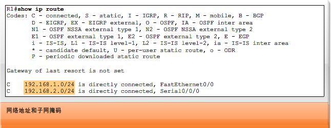 192.168.1.0/24 - 这是直连网络或远程网络的网络地址和子网掩码。在本例中,路由表的两个条目 192.168.1.0/24 和 192.168.2.0/24 都是直连网络。