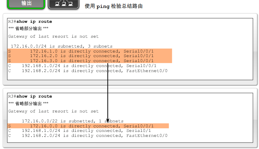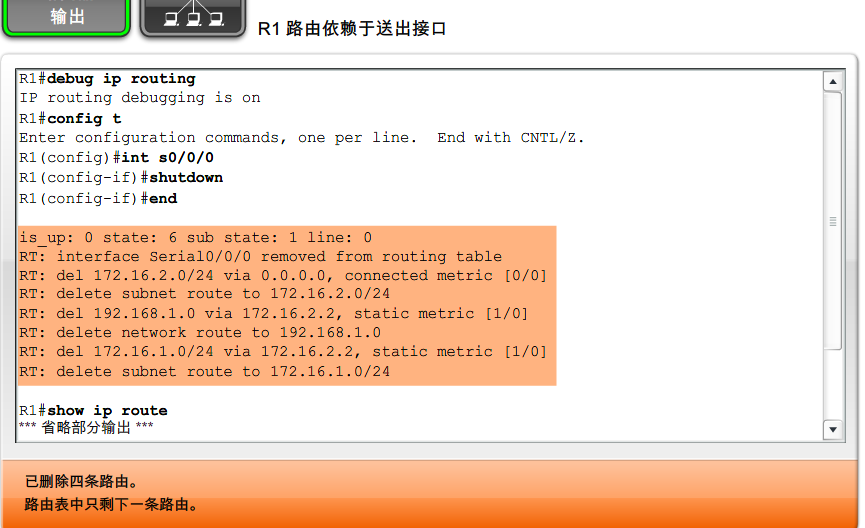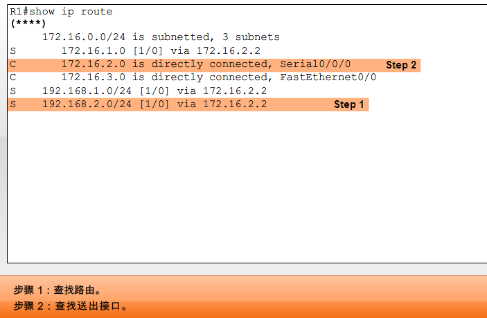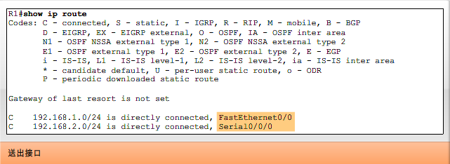 FastEthernet 0/0 - 路由条目末尾的信息,表示送出接口和(或)下一跳路由器的 IP 地址。在本例中,FastEthernet0/0 和 Serial0/0/0 都是用于到达这些网络的送出接口。
