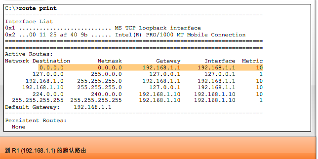 当路由表包含远程网络的路由条目时,还会包括额外的信息,如路由度量和管理距离。路由度量、管理距离。PC 也有路由表。在下图中,您可以看到 route print 命令的输出。此命令会显示所配置或获得的网关、相连网络、回环网络、组播网络和广播网络。本课程不会分析 route print 命令的输出。此处举例的目的是强调所有配置了 IP 的设备都应该有路由表。