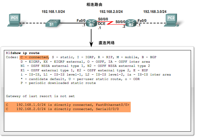 直连网络 — 如果数据包目的 IP 地址属于与路由器接口直连的网络中的设备,则该数据包将直接转发至该设备。这表示数据包的目的 IP 地址是与该路由器接口处于同一网络中的主机地址。