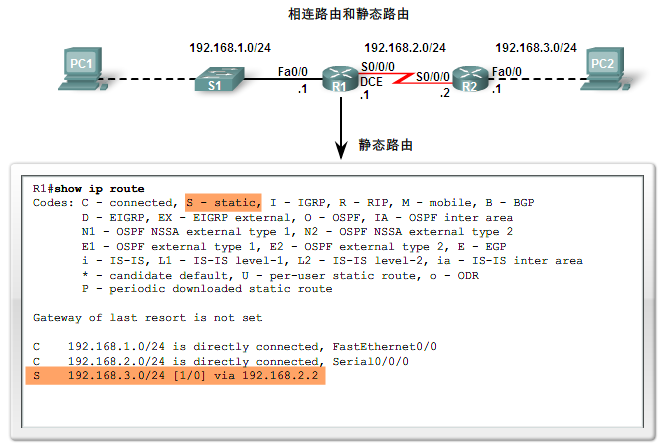 注:图中 R1 的路由表显示,R1 已获知两个远程网络:其中一条路由通过 RIP 动态获得,另一条静态路由为手动配置。此例子显示了路由表是如何同时包含动态获知的路由以及静态配置的路由,但它并不代表这种方法是该网络的最佳配置方法。