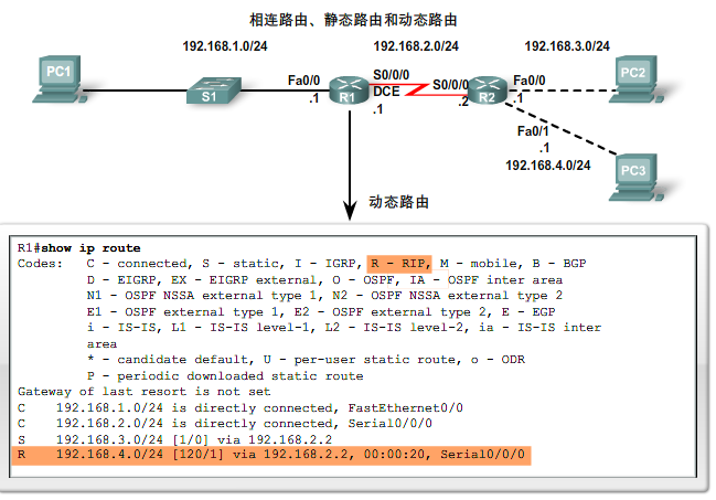 使用动态路由协议也可将远程网络添加到路由表中。如图所示,R1 已经通过动态路由协议 RIP(路由信息协议)从 R2 自动获知 192.168.4.0/24 网络。RIP 是最早的 IP 路由协议之一,我们将在稍后的章节中再详细讨论。