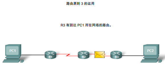 1. 做出路由决定后,路由器 R1 将流向 PC2 的数据包转发至路由器 R2。R1 仅了解其自身路由表中的信息,该信息表明路由器 R2 是下一跳路由器。R1 并不知道 R2 是否确实具有到达目的网络的路由。