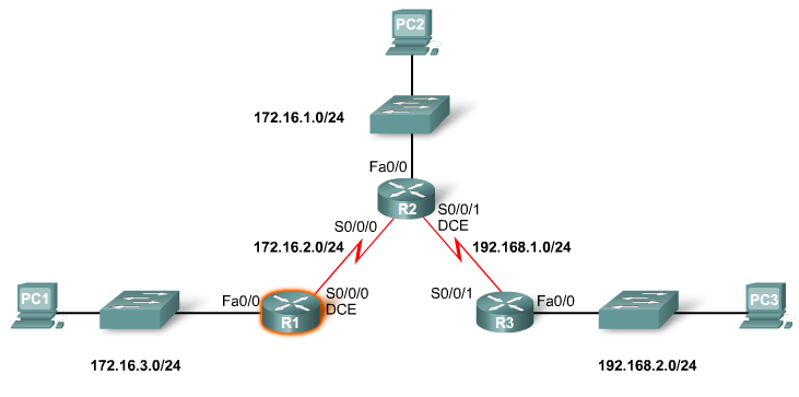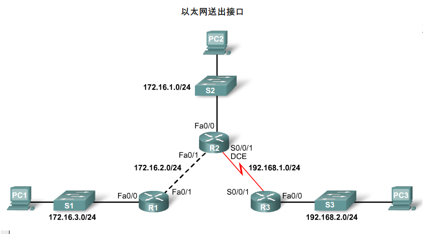 注:串行链路的两端并不需要使用相同的接口(本例中为 Serial 0/0/0)。但是,由于两者都属于同一个网络,因此都必须拥有属于 172.16.2.0/24 网络的 IP 地址。(术语网络和子网在此情况下可以互换使用。)R2 的 Serial 0/0/0 接口配置的 IP 地址和子网掩码为 172.16.2.2/24。