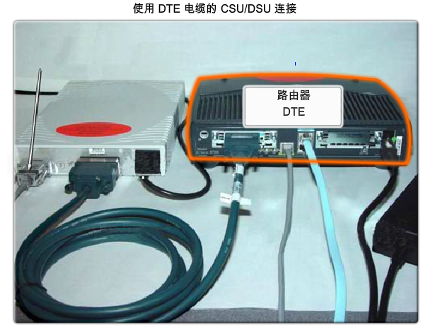 一般情况下,路由器是作为 DTE 设备连接到 CSU/DSU(即 DCE 设备)。CSU/DSU(DCE 设备)用于将来自路由器(DTE 设备)的数据转换为 WAN 服务提供者可接受的格式。CSU/DSU(DCE 设备)还负责将来自 WAN 服务提供者的数据转换为路由器(DTE 设备)可接受的格式。路由器一般通过串行 DTE 电缆连接到 CSU/DSU,如右图所示。
