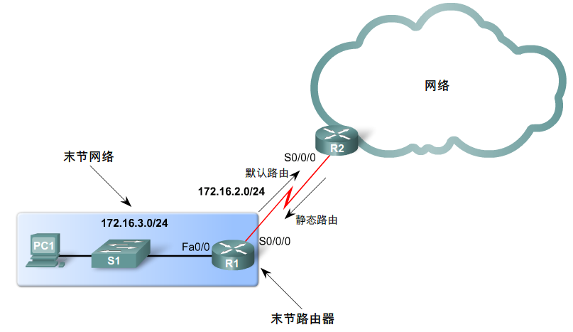 如前一节所述,当路由器接口配置有 IP 地址和子网掩码时,此接口即成为该网络上的主机。例如,当右图中 R1 的 FastEthernet 0/0 接口配置有 IP 地址 192.168.1.1 和子网掩码 255.255.255.0 时,FastEthernet 0/0 接口即成为 192.168.1.0/24 网络的一员。连接到同一 LAN 的主机(如 PC1)也配置有属于 192.168.1.0/24 网络的 IP 地址。
