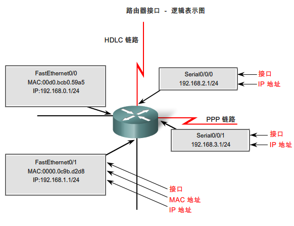 如下图所示的路由器有四个接口。每个接口都有第 3 层 IP 地址和子网掩码,表示该接口属于特定的网络。以太网接口还会有第 2 层以太网 MAC 地址。