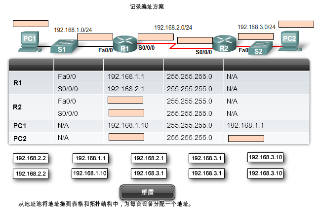 路由器 R1 和主机 PC1 的记录已填好。请将表格下方的 IP 地址拖至对应的空白位置,从而将表格和图补充完整。