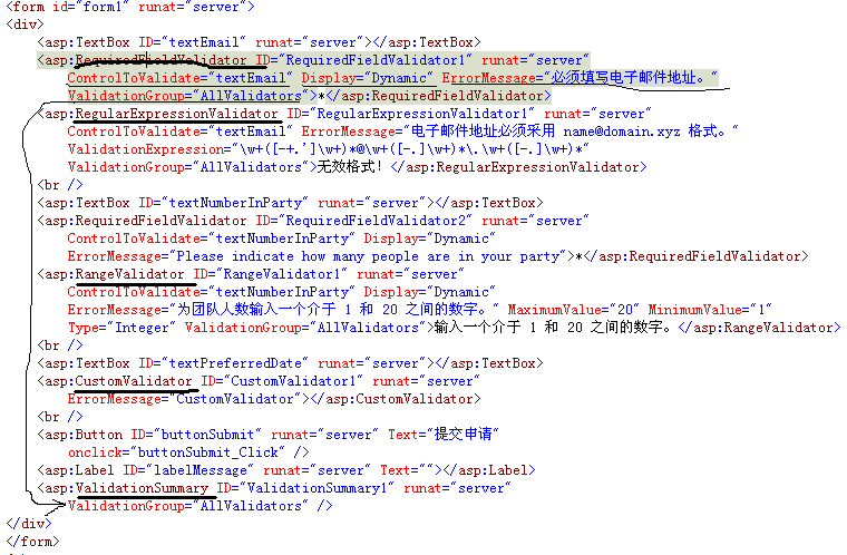 在用户提交该页时运行该代码。 该代码使用传入处理程序的 ServerValidateEventArgs (args) 对象与该验证程序控件交互。 用户在 textPreferredDate 文本框中所输入的值作为 args 对象的 Value 属性传递。在检查用户输入是否有效后,将 args 对象的 IsValid 属性相应地设置为 true 或 false。 如果将该属性设置为 false,则该验证程序将显示其错误消息。在本示例中,该代码使用 try-catch 块确定用户输入是否可以转换为 DateTime 对象。 如果用户输入一个无效值(不符合 m/d/yyyy 日期格式的任何值),则 DateTime 对象的ParseExact 方法会引发一个异常,并执行 Catch 块。