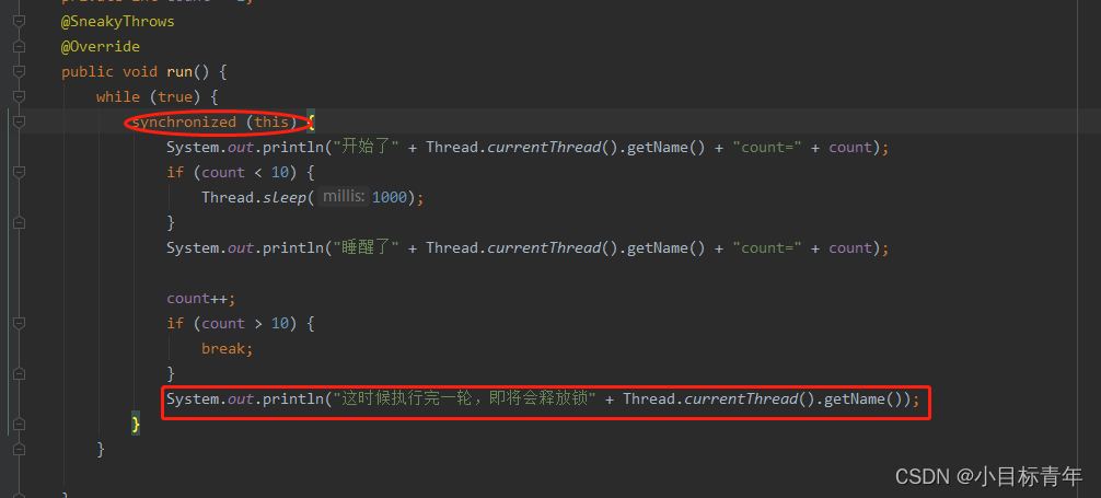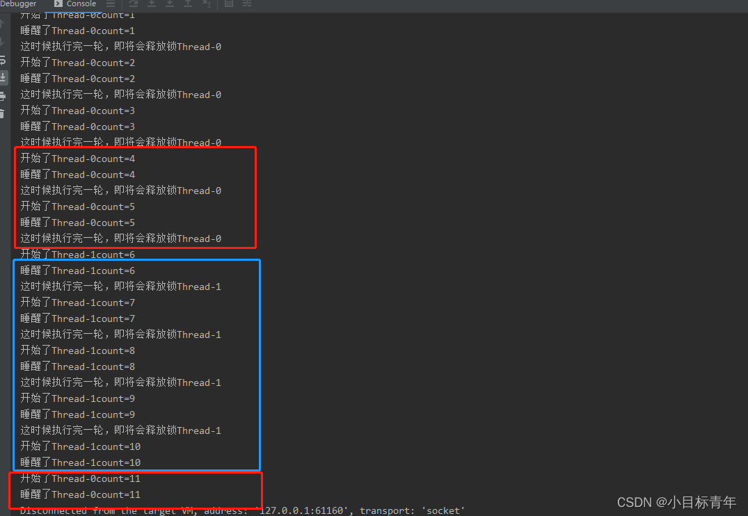 可以看到跟上一次效果一样,先拿到锁资源的线程0, 任意妄为,sleep 休息了很久,但是就是不把锁资源让出来, 别人 线程1 只能等到这个线程完全执行完了,才能拿到锁资源,但是此时count已经大于10了,拿到也没意思,只能根据逻辑出来了。