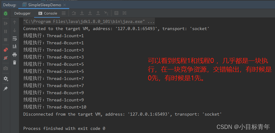 可以看到,红色是线程 0 ,蓝色是线程1 ,两个线程有交替输出现象。
