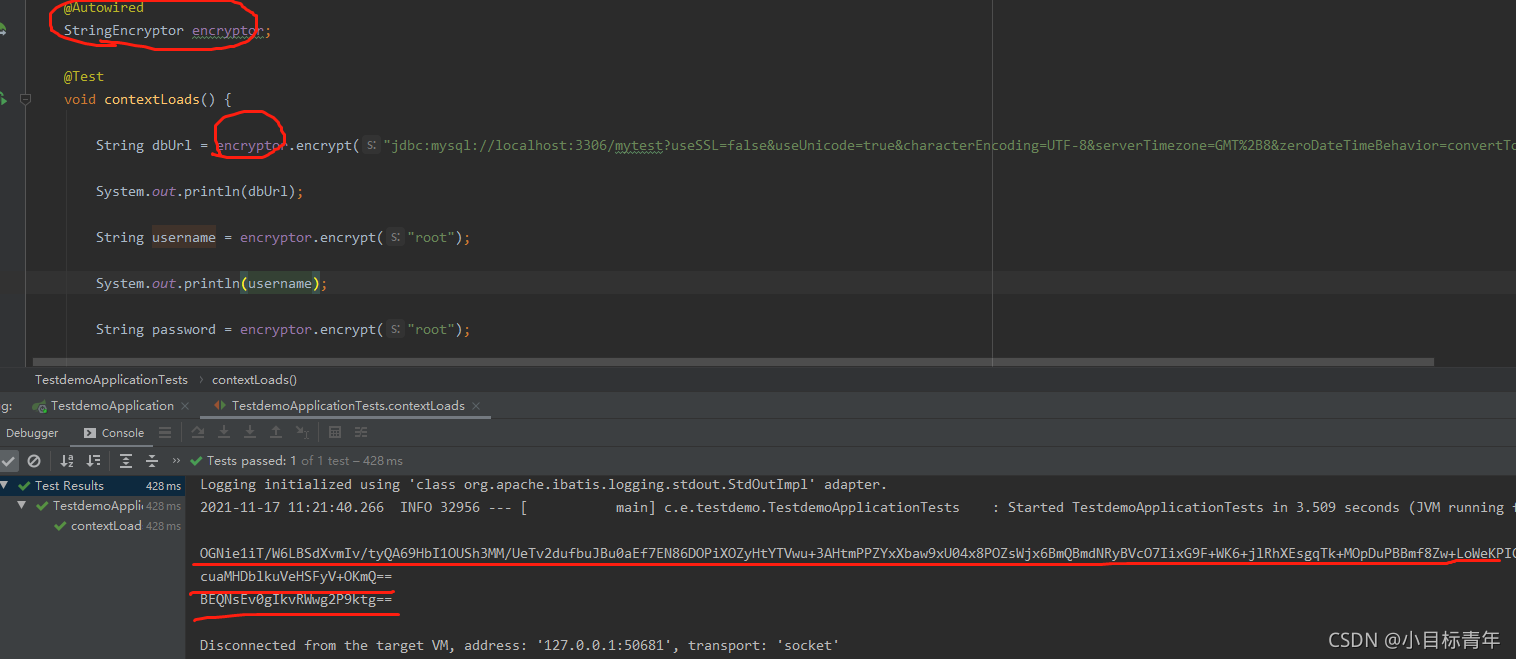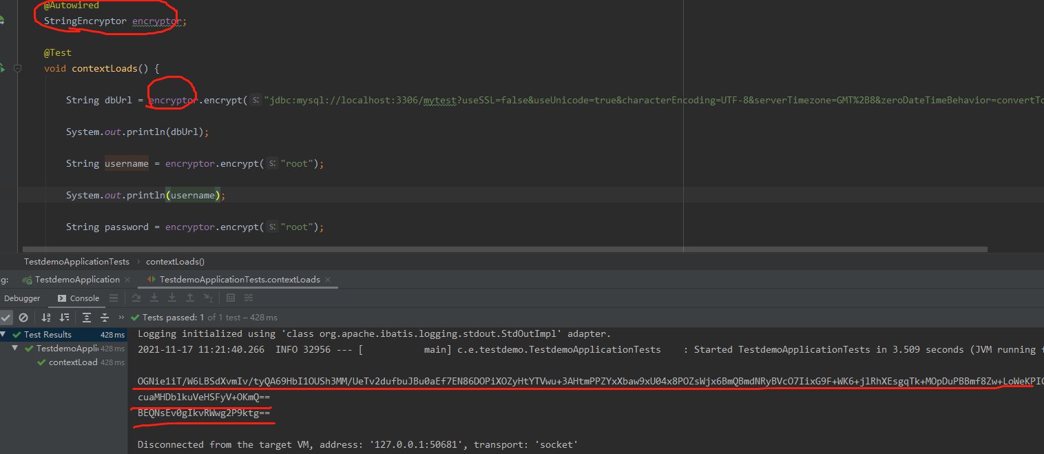 String dbUrl = encryptor.encrypt("jdbc:mysql://localhost:3306/mytest?useSSL=false&useUnicode=true&characterEncoding=UTF-8&serverTimezone=GMT%2B8&zeroDateTimeBehavior=convertToNull");