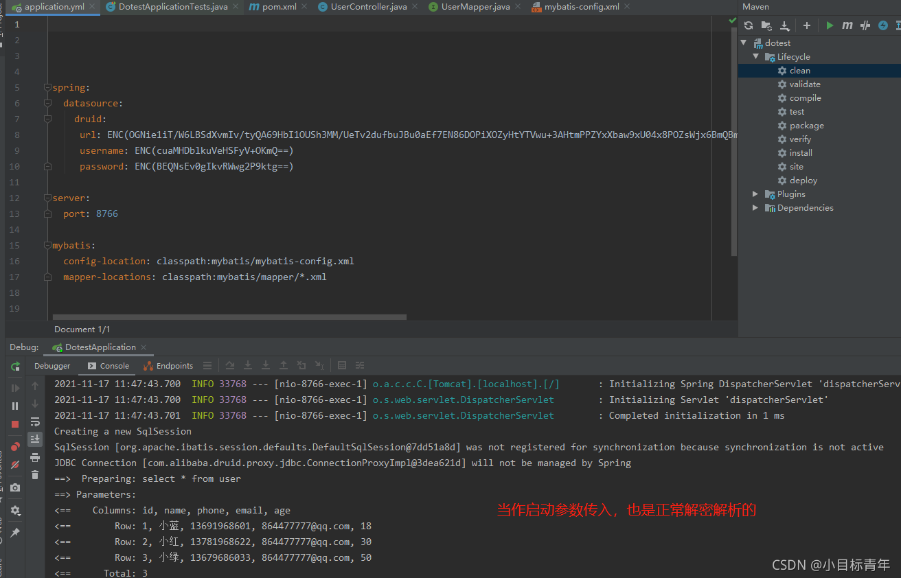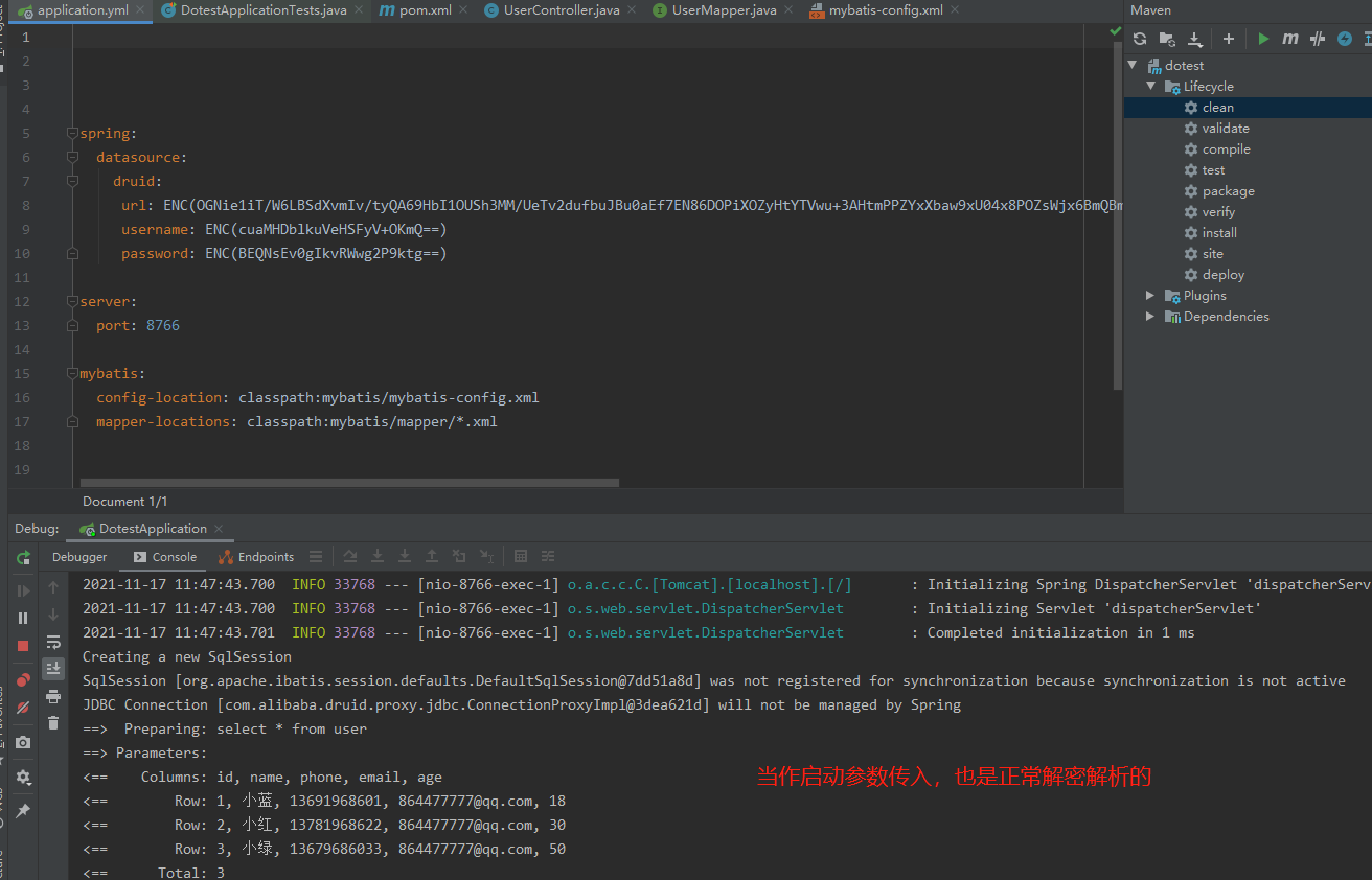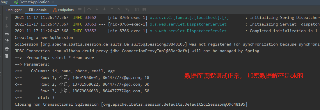 5. 运行项目,调用查询接口,看看是否能正常获取数据库数据,校验相关敏感数据是能正常解密解析的:
