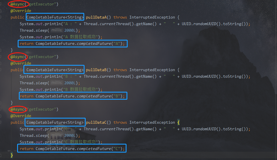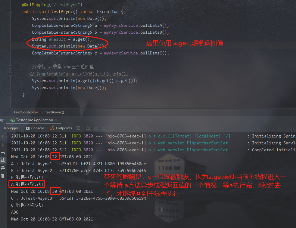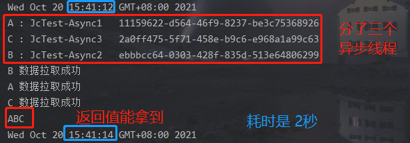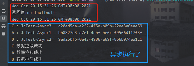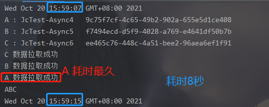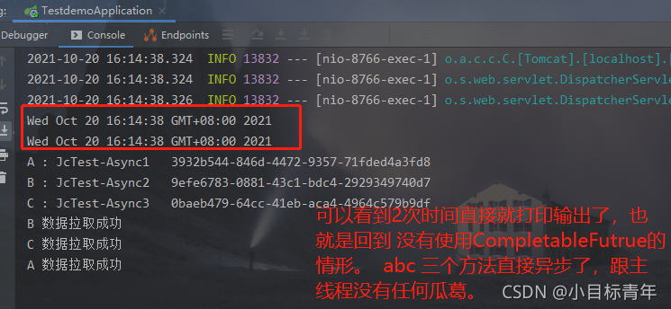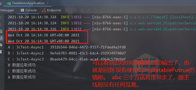 这种情况,我们使用了 CompletableFuture<String>分别去接收返回值,但是我们后面没去使用操作它们,也没使用allOf , 看下运行结果: