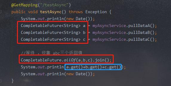 只要我想要某个异步线程的返回值,我就把这个方法返回接收值CompletableFuture 加入到 allOf 里面去 。