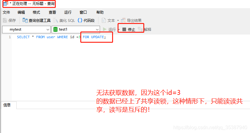 3.那么也是基于当前情况,我们再执行一下使用排他写锁的查询语句,可以发现 读写互斥了:
