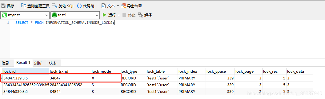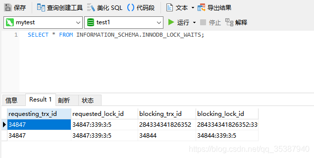可以从结果中看出 事务请求id 34847在等待锁: