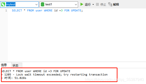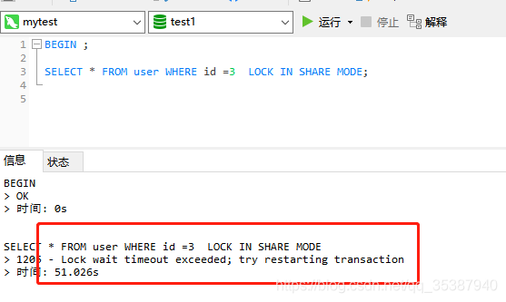 所以mysql会有个等待锁资源超时的机制,这种情况就会直接返回查询失败的结果。
