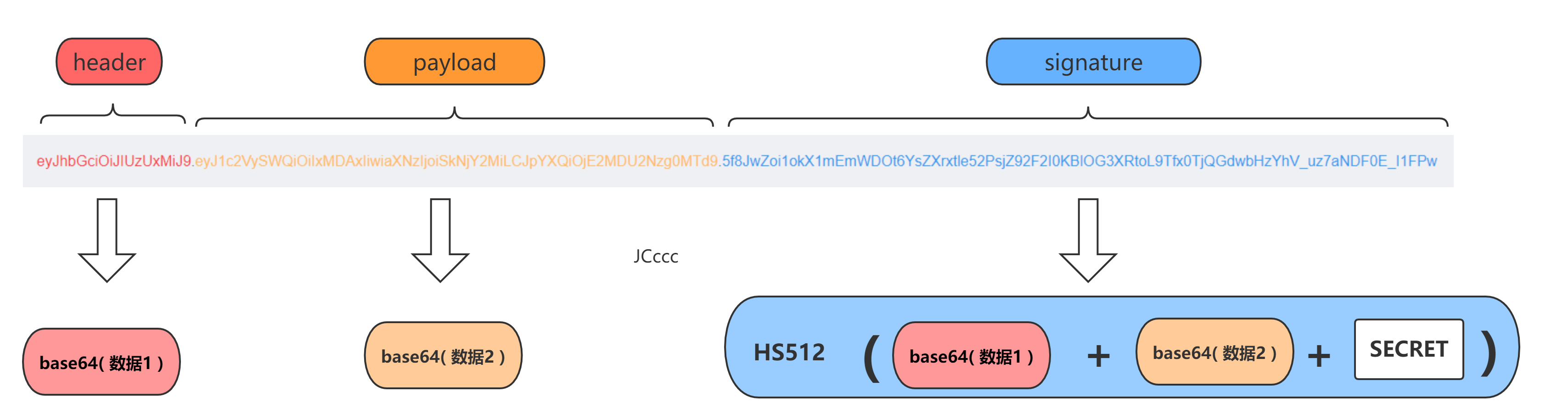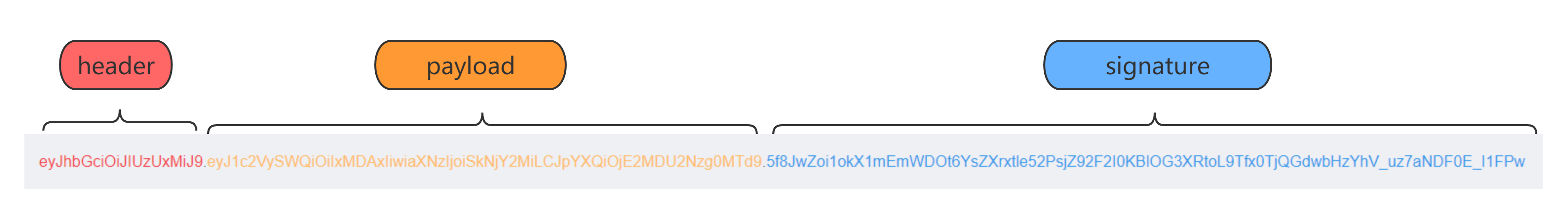 没错,每一段不同颜色的字符串之间 可以看到,使用了符号 ’ . ‘ 进行了拼接。 一共三段字符串分别是 header 、payload、signature,组成了 所谓的 token令牌。