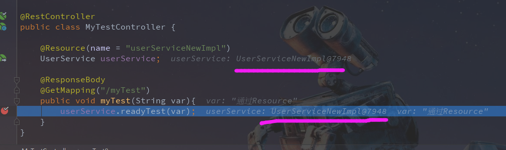 因为两个实现类bean都实现了UserService ,那肯定找到两个了,也就是有异常了,然后name我们写的是userService(实际两个业务实现类我们用@Service丢到spring容器里面默认名字是首字母小写userServiceImpl,userServiceNewImpl),根本没有userService这个东东。