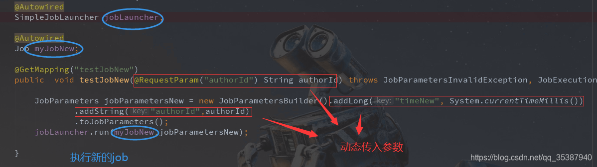 public void testJobNew(@RequestParam("authorId") String authorId) throws JobParametersInvalidException, JobExecutionAlreadyRunningException, JobRestartException, JobInstanceAlreadyCompleteException {