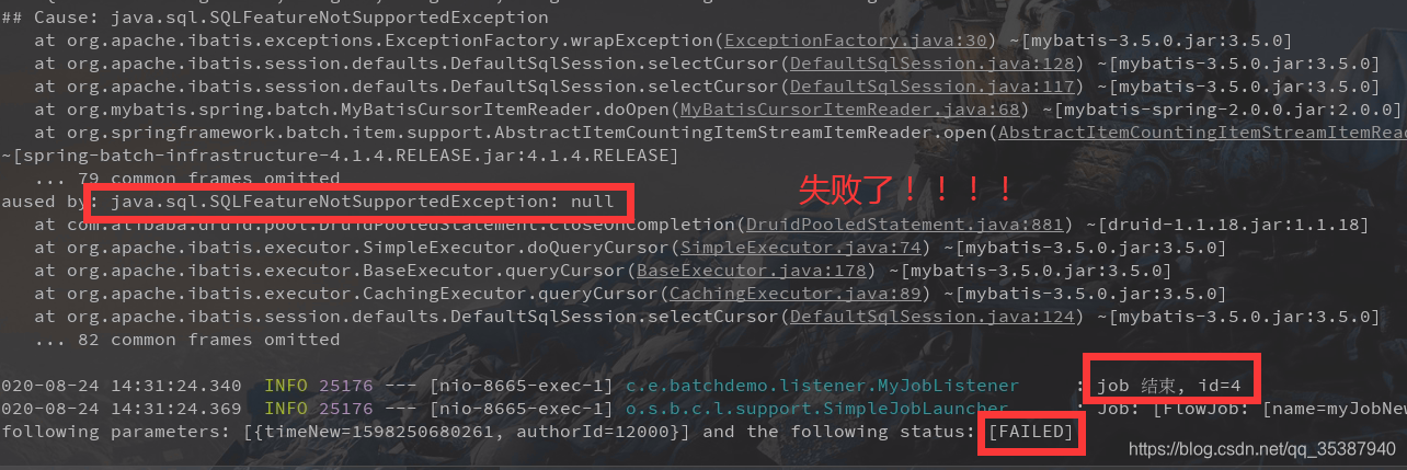 没错,这就是失败的,原因是因为跟druid有关,报了一个数据库功能不支持。 这是在数据读取的时候报的错。