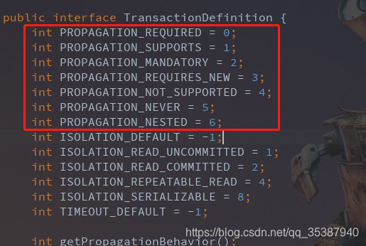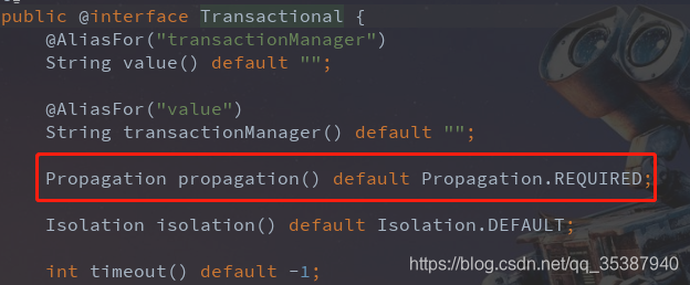 同样可以在注解@Transactional里面看到, 默认配置了的是 Propagation.REQUIRED (文章的主角)