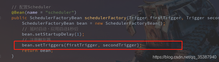 public SchedulerFactoryBean schedulerFactory(Trigger firstTrigger, Trigger secondTrigger) {