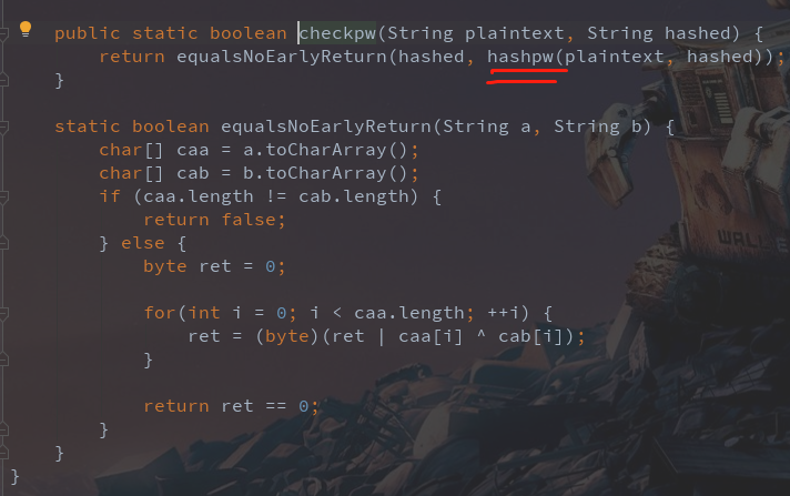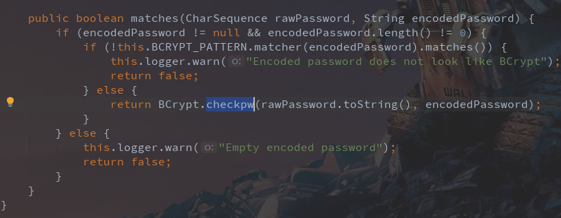 没错,因为哈希无法逆操作,所以匹配过程中也是用了hashpw 。 可以看到了checkpw这个方法,我们传入的密文其实命名已经是 hashed ,没错,这个密文就是一个带有盐值的哈希。