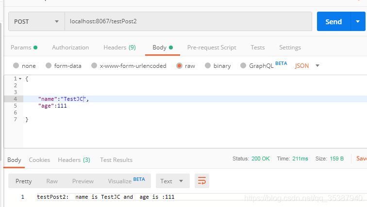 return "testPost1: name is "+ cat.getName()+" and age is :"+cat.getAge();