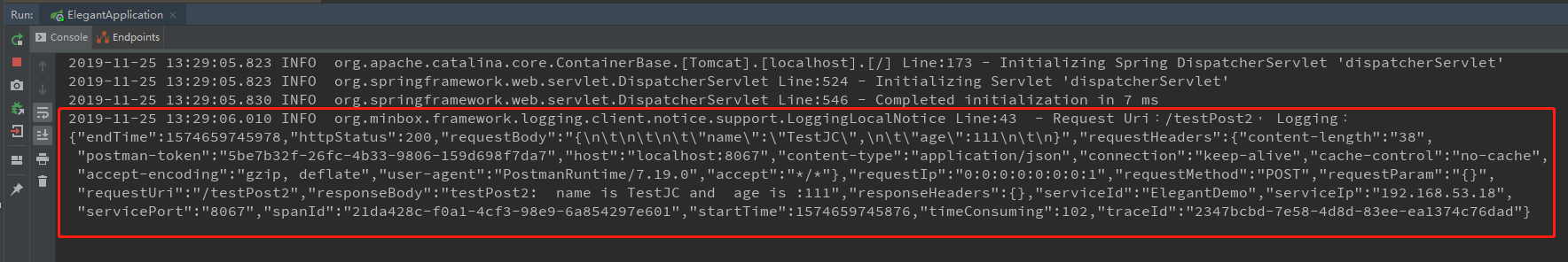 那么我们重新启动下项目,再调用下接口: