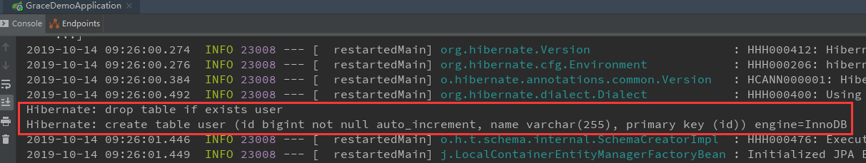 把项目运行起来,可以看到控制台里输出了关于自动创建数据库表的相关操作日志: