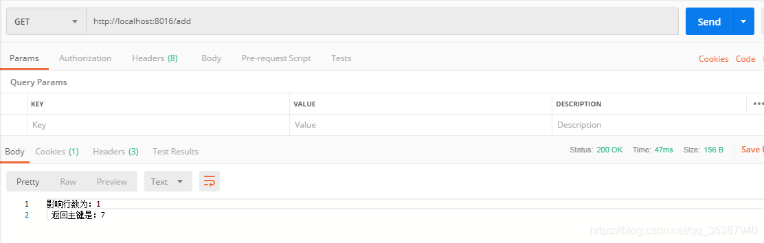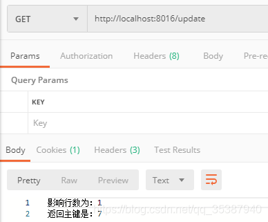 return "影响行数为:"+result+"\n返回主键是:"+id;