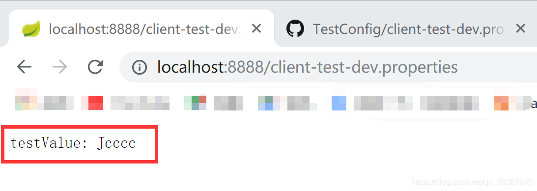 可以看到返回值就是我们配置文件里面的值,证明 服务实例已经和github成功打通, 那么下篇https://blog.csdn.net/qq_35387940/article/details/94619086