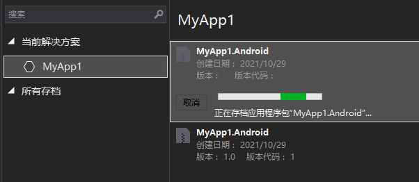 3. 点击 存档 之后,VS会自动进行打包