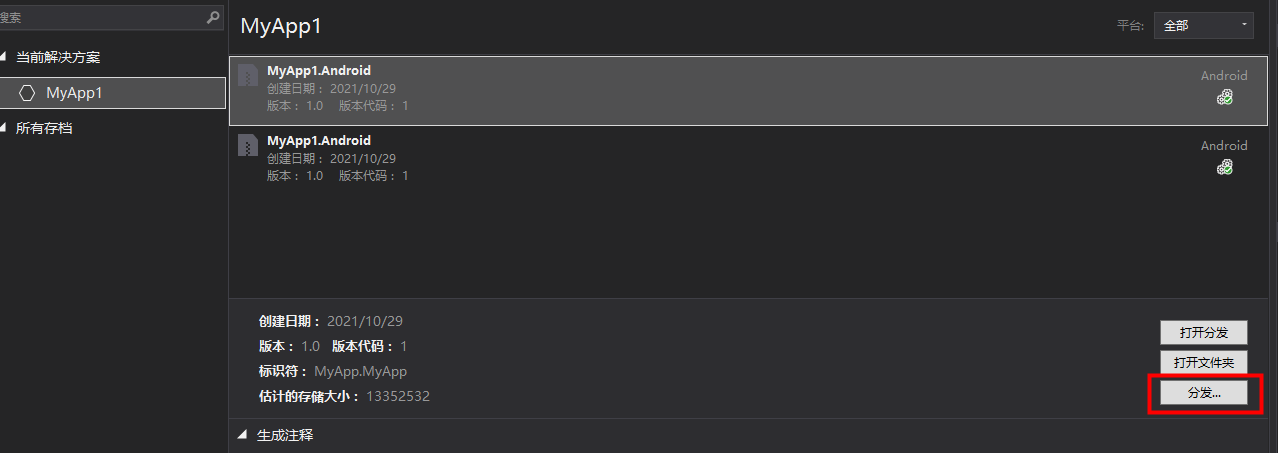 4. 等待打包完成之后,点击 分发