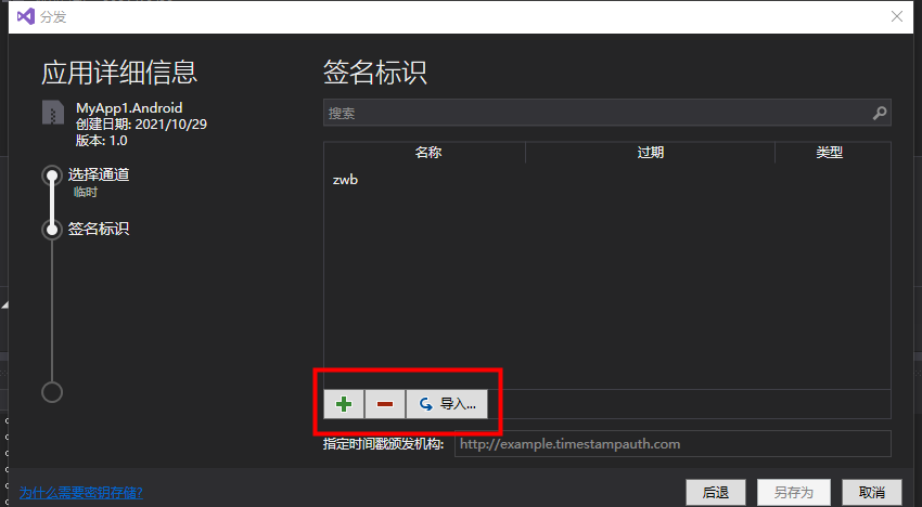 6. 如果是第一次打包,需要添加一个签名标识;如果之前已经添加过了,则选择任一签名标识