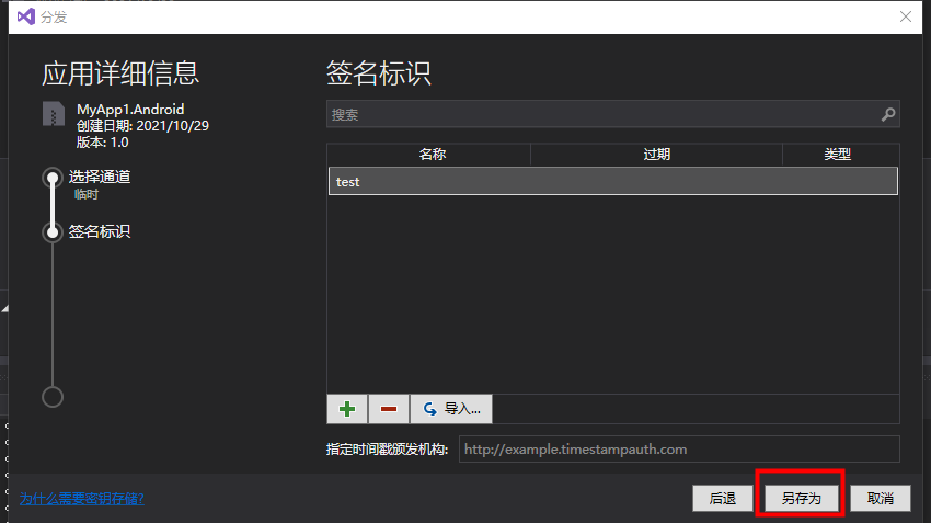 7. 添加完成之后选择刚刚生成的签名标识,然后点击 另存为 按钮,并选择文件的路径